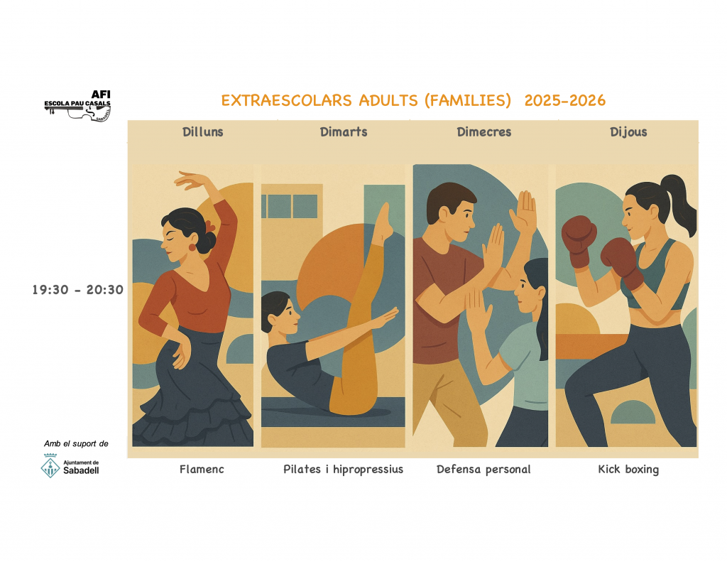 Les activitats extraescolars per a adults tenen com a objectiu oferir un espai de benestar i relació per a les famílies de l’Escola Pau Casals, tot promovent hàbits saludables, cohesió comunitària i aprenentatge al llarg de la vida. Es pretén: