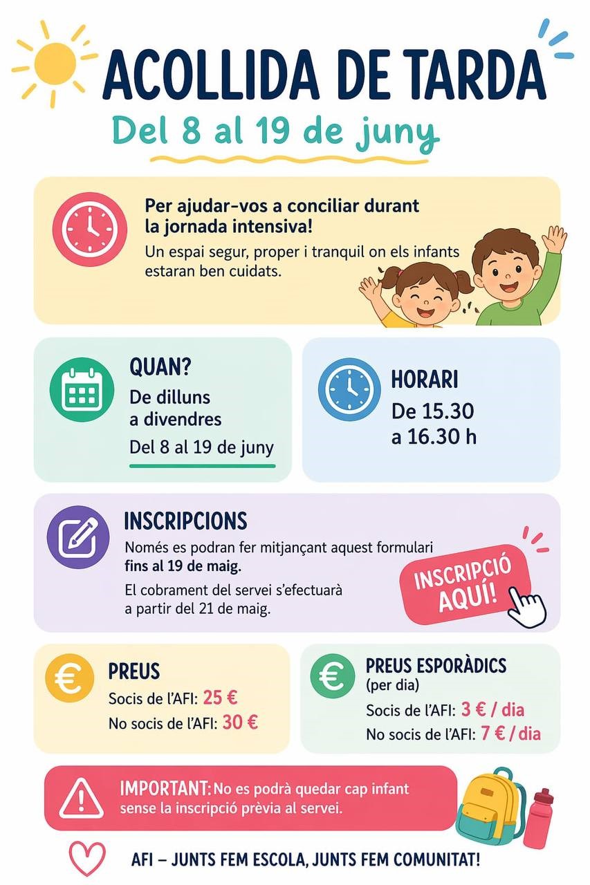 📢 Benvolgudes famílies! Arriba la jornada intensiva i, com cada any, el gran repte de quadrar horaris, agendes, feines i organització familiar! ⏰😅Però no patiu, perquè des de l’AFI us ho volem posar una mica més fàcil. ➡️ Per aquest motiu, l’AFI organitza i gestiona el servei d’acollida de tarda, del 8 al 19 de […]
