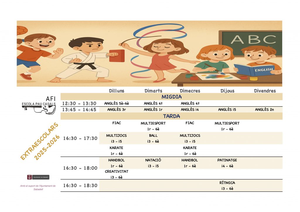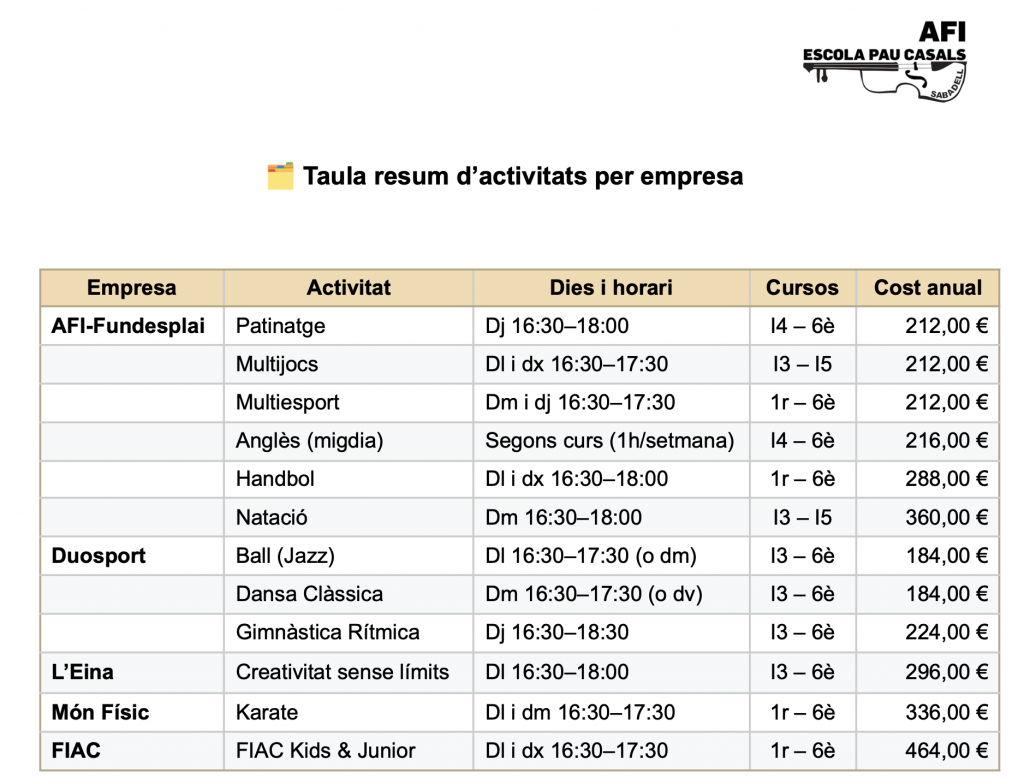 - Algunes activitats poden requerir material específic (com patins, banyador, karategi…).
