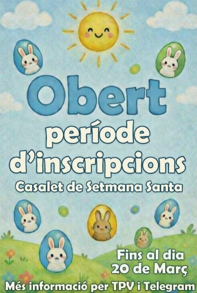 Benvolgudes famílies,Ja estan obertes les inscripcions per al Casalet de Setmana Santa!Per formalitzar la inscripció:👉 Accediu a l’enllaç, ompliu el formulari i escolliu la franja horària i els dies desitjats: