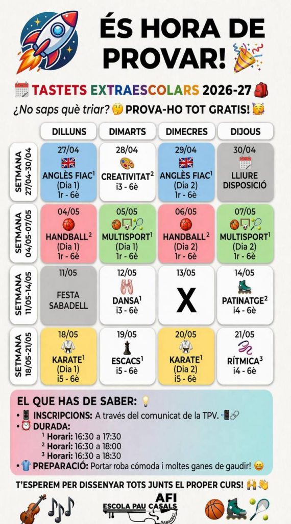 Us convidem a descobrir i provar algunes de les activitats que estem preparant… 🎨⚽🧪🎭